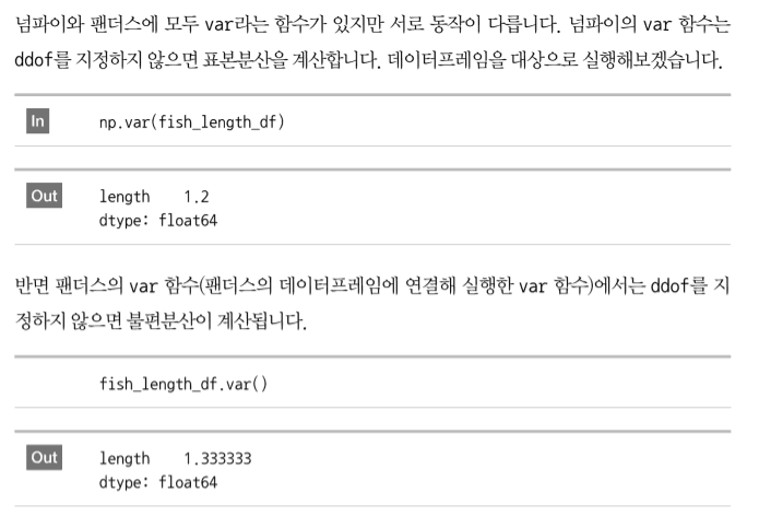 위의 내용은 책의 내용을 일부 캡쳐한 것인데요. 데이터 분석시 가장 많이 사용하는 pandas와 numpy에서 분산을 구하는 var함수가 어떻게 다르게 구현되어 있고, 어떻게 하면 같은 값을 얻을 수 있는지를 자세하게 설명해주고 있습니다.