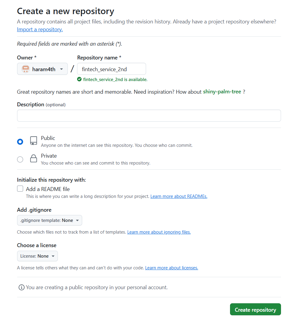 이 예제에서는 Repository name을 fintech_service_2nd 로 지정했다.