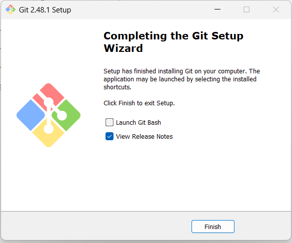 git 설치가 완료되면 Finish를 눌러 닫는다.