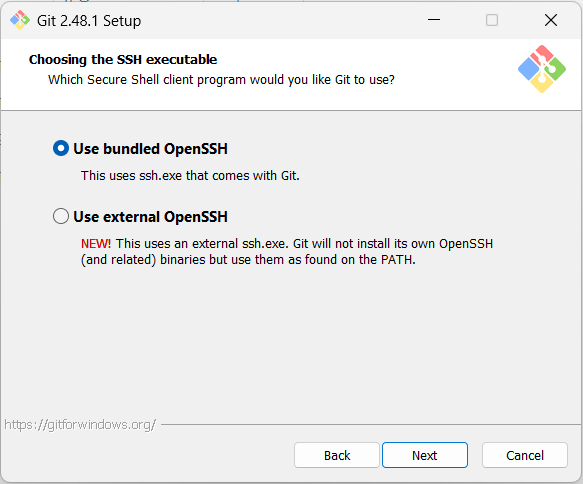 Choosing the SSH executable 도 기본값인 Use bundled OpenSSH 를 유지하고 Next 클릭