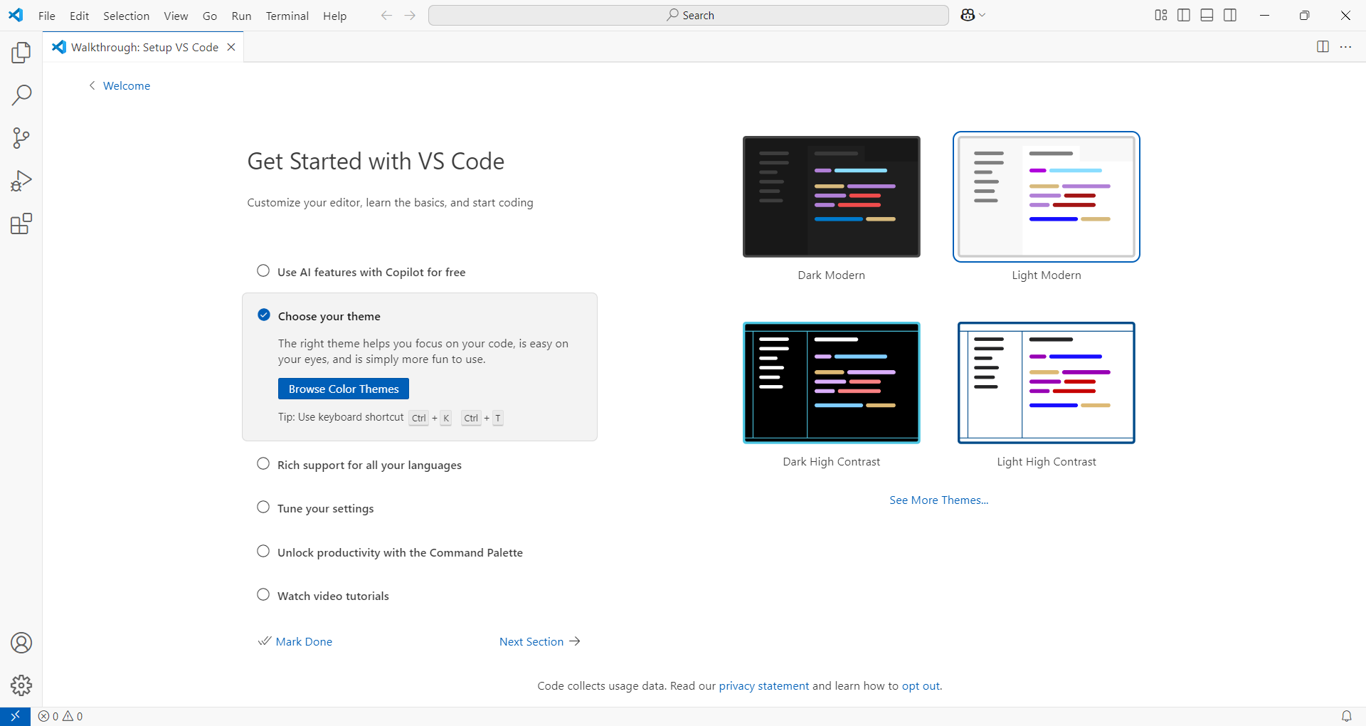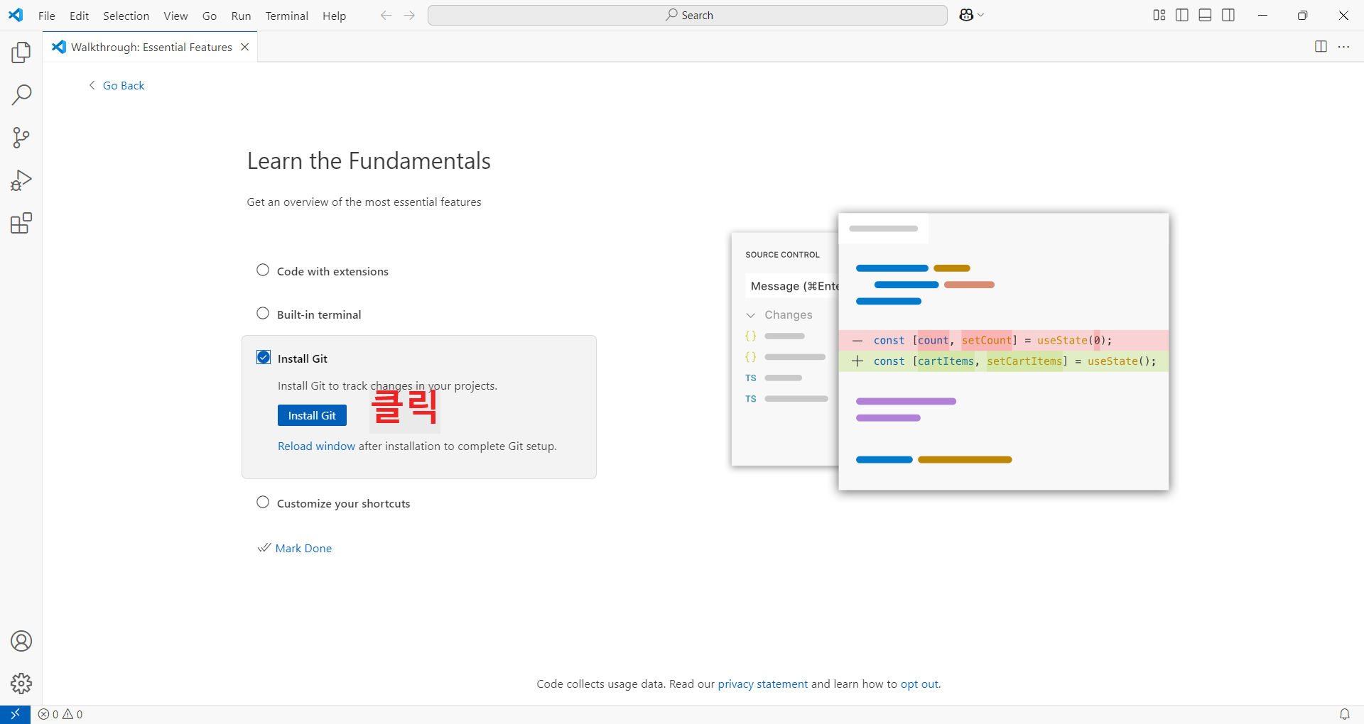 종료를 누르고 나면 vscode가 실행되고 설정 화면이 나온다.