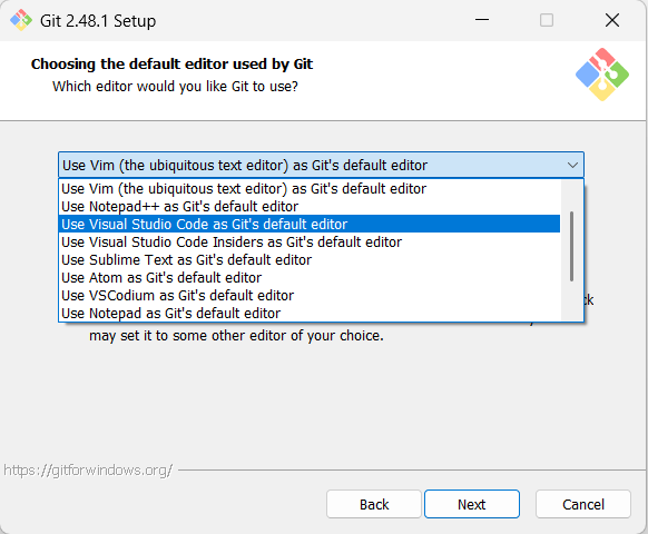 Choosing the default editor used by Git 에서 드롭다운 메뉴를 클릭해
