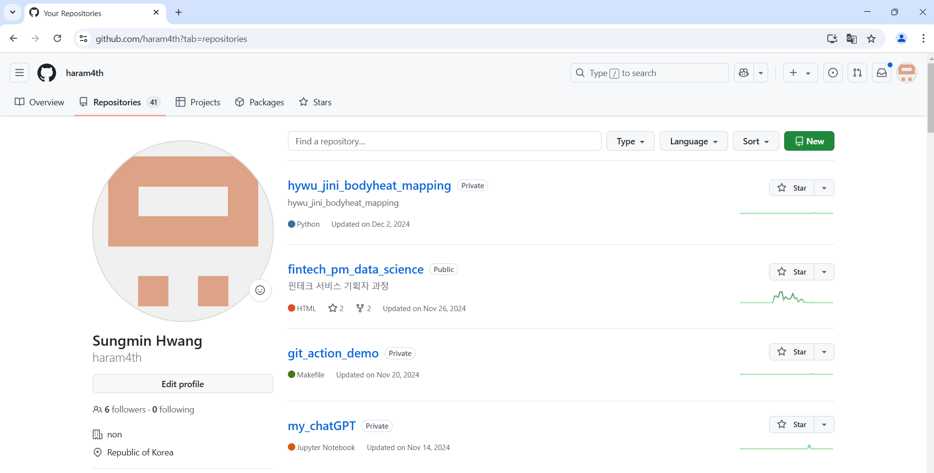 브랜치 이름이 main인지 확인하자 혹시 master로 나온다면 git branch -M main을 이용해서 브랜치를 main으로 변경해야 한다. 우리는 위에서 git을 설치할 때 main으로 변경하도록 했기 때문에 기본적으로 main으로 설정되어 있다.