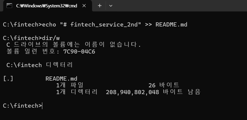 (2) 경로가 C:\fintech> 인지 확인한 후 echo "# fintech_service_2nd" >> README.md 를 붙여 넣은 후 실행한다.