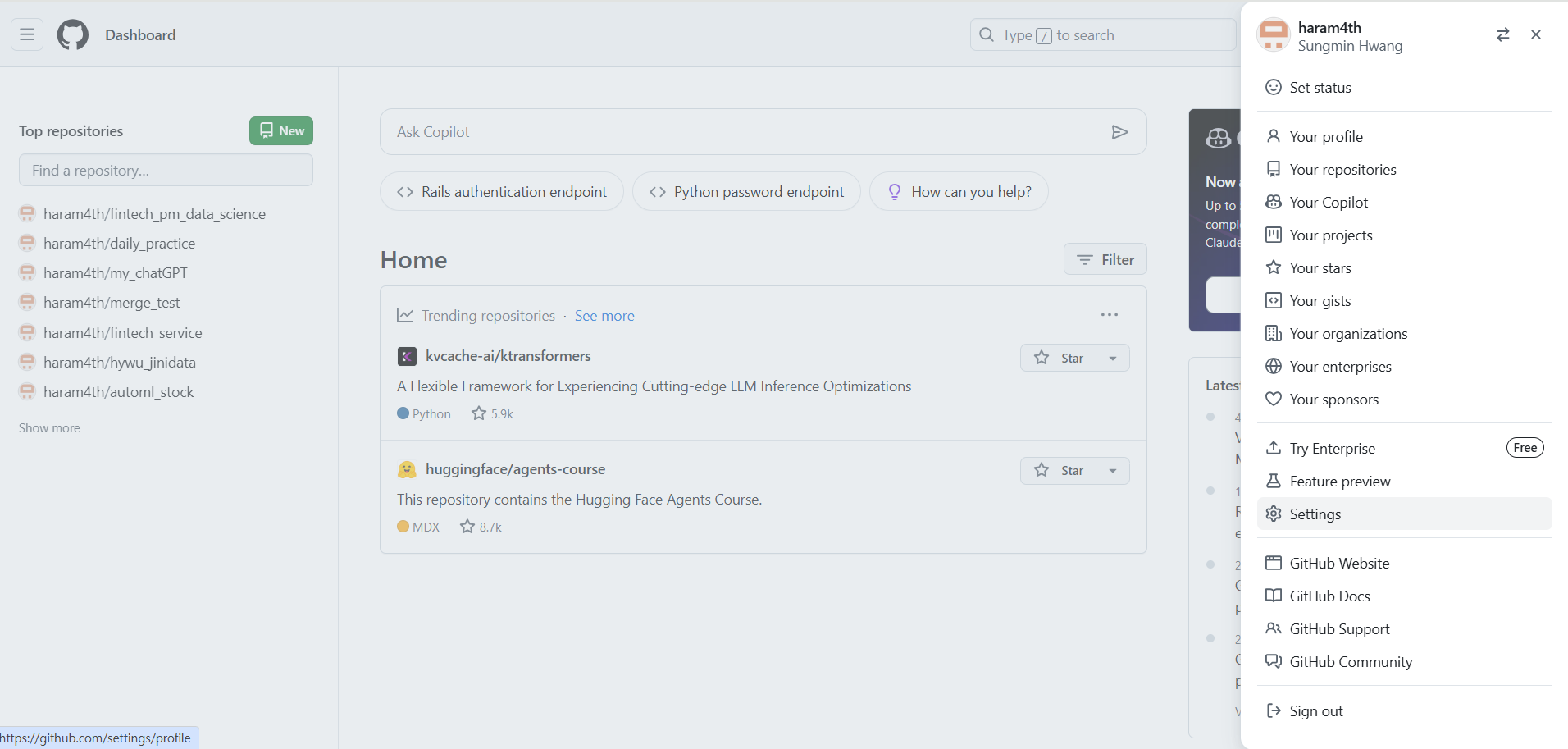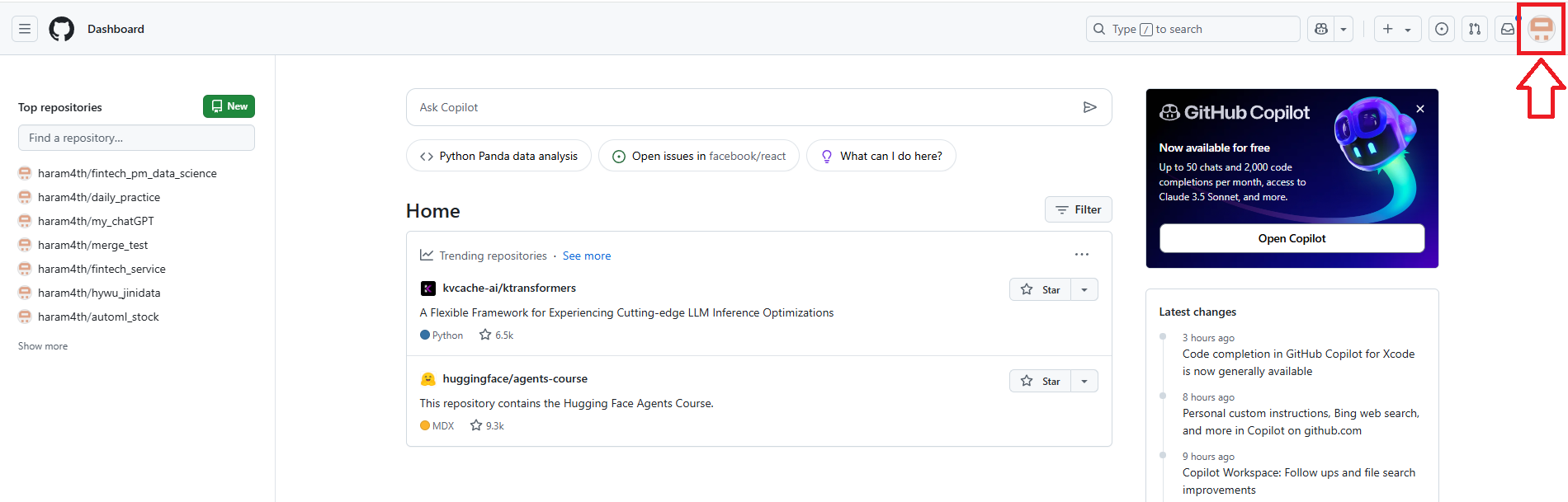 (8) 오른쪽 상단의 프로필 아이콘을 다시 누르고 나오는 메뉴에서 Your repositories를 클릭한다.