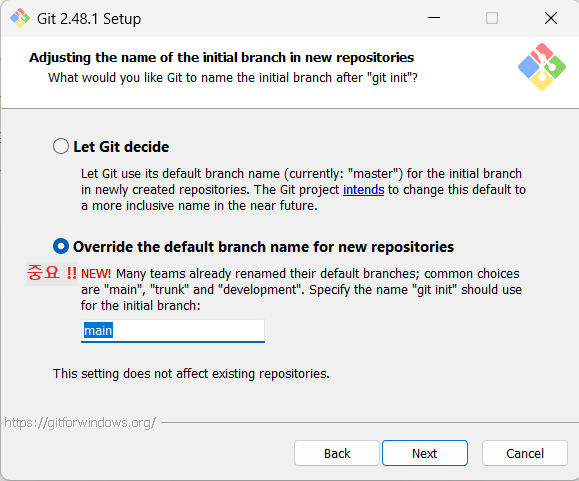 Adjusting the name of the initial branch in new repositories가 나오면 아래쪽의