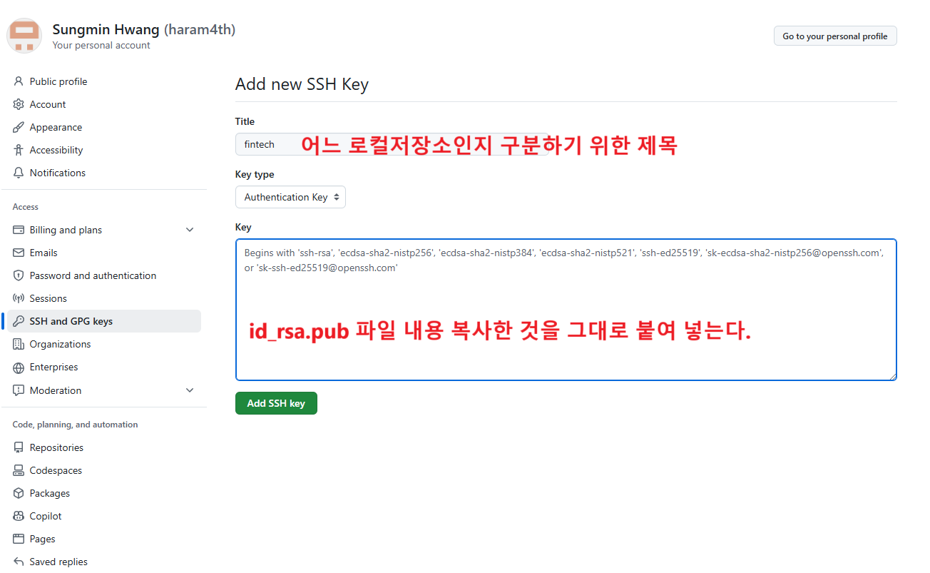 여기서 녹색의 New SSH key 등록버튼을 클릭해 아까 복사했던 ssh-public key를 등록하자.