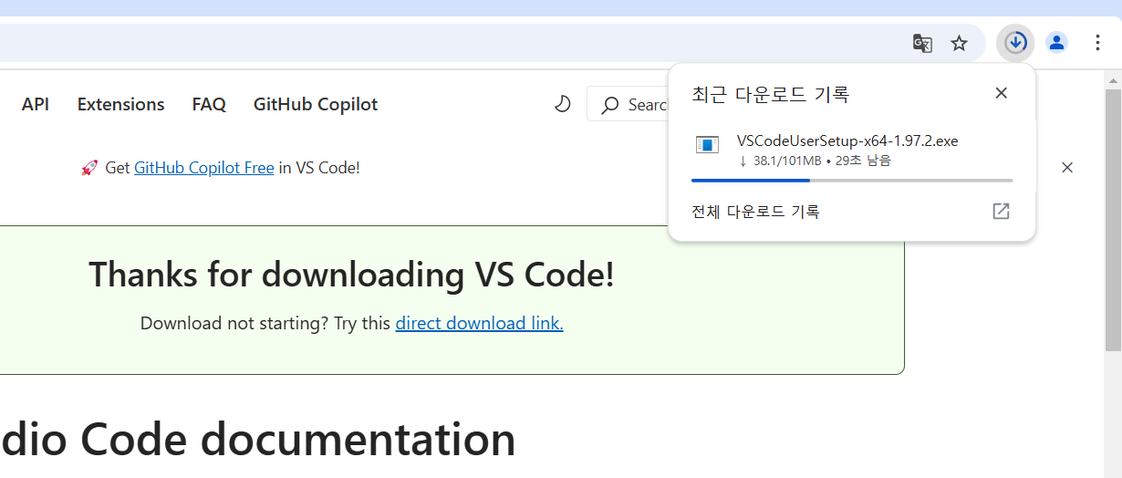 크롬브라우저의 오른쪽 상단에 다운로드 상황이 표시되면서 다운로드가 된다.