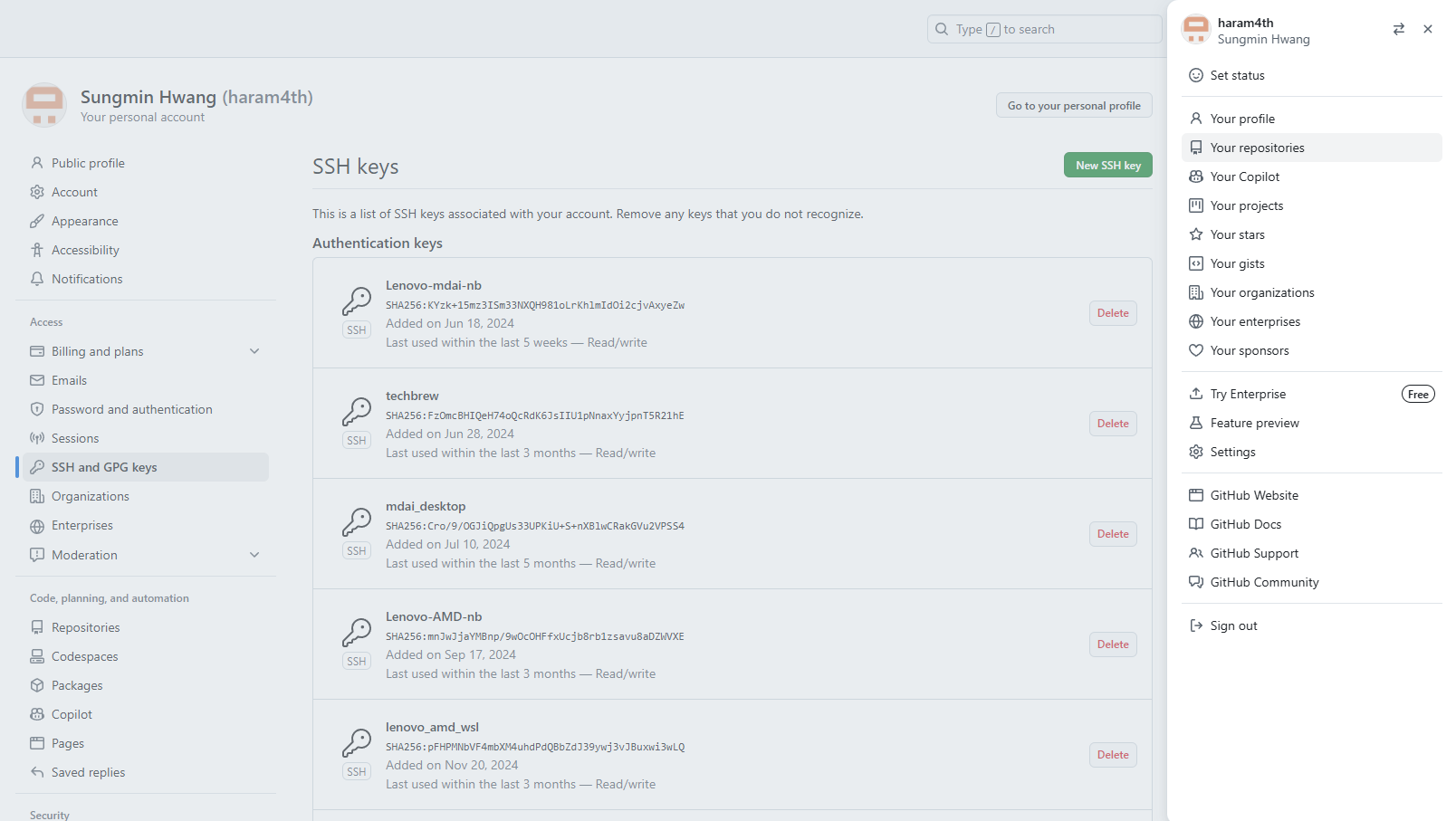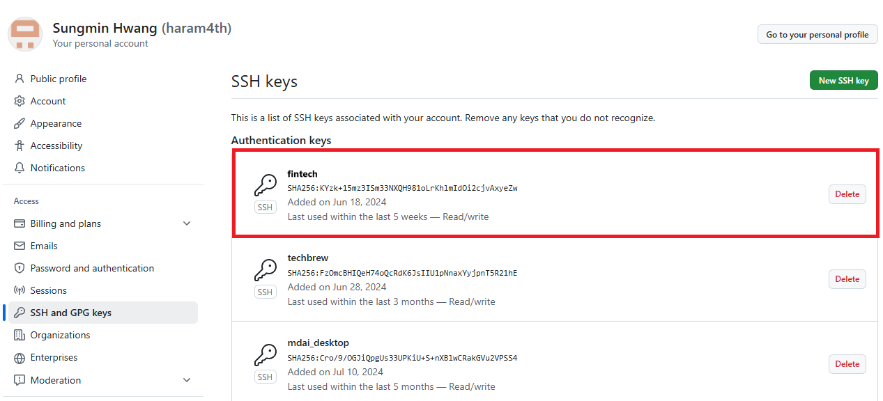 (5) Settings를 클릭하면 왼쪽에 메뉴가 표시되는데 그중에서 SSH and GPG keys를 클릭한다.