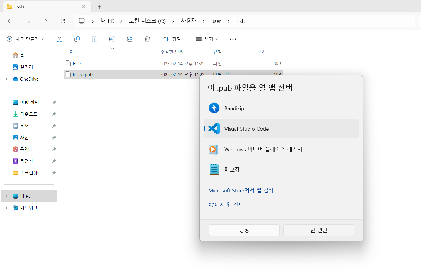 id_rsa.pub파일을 선택하고 더블 클릭하면 .pub 파일을 열 앱을 선택하는 창이 나온다.