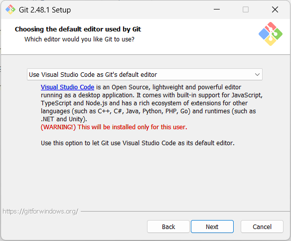 Use Visual Studio Code as Git's default editor 선택