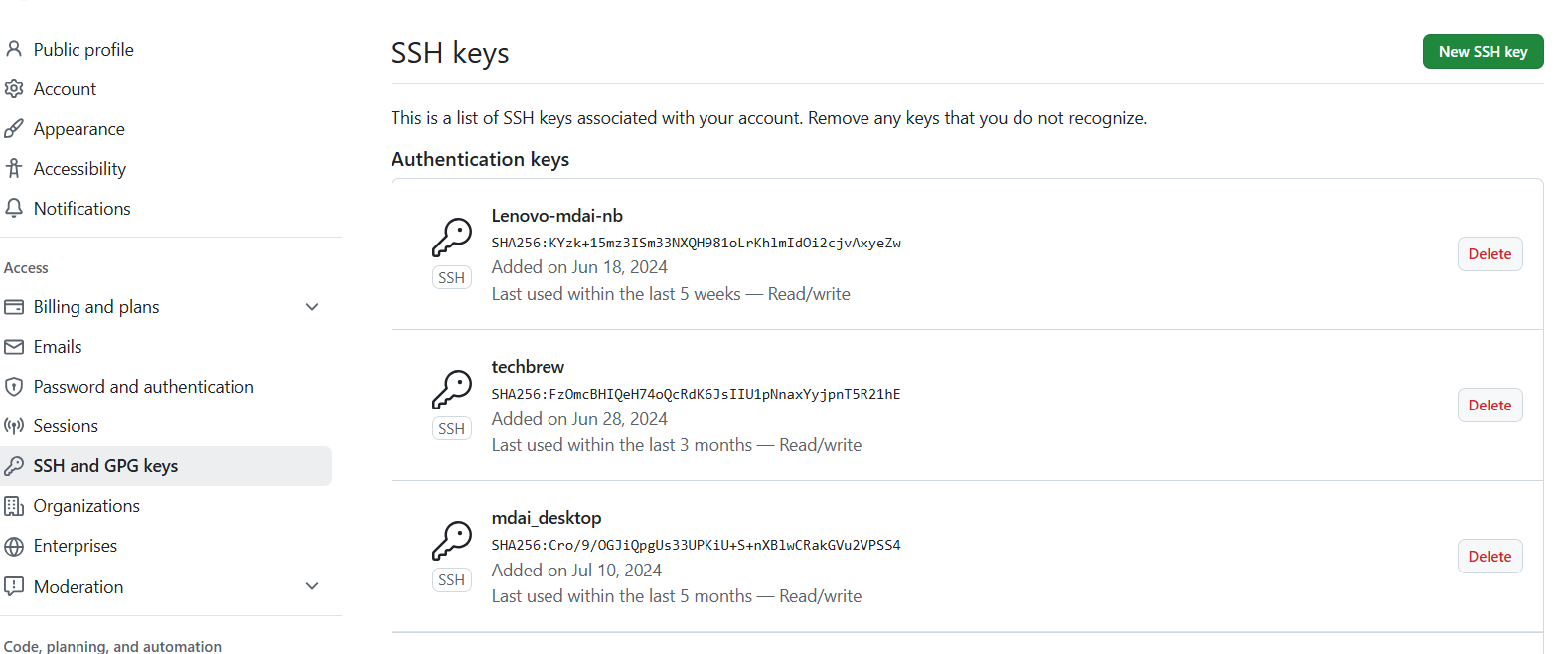 그러면 오른쪽에 SSH keys가 표시되고 녹색의 New SSH key 등록버튼이 보일것이다.