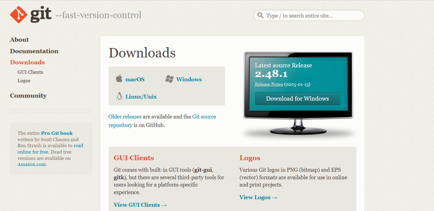 git 홈페이지로 이동하면 아래와 같이 나오는데 왼쪽 메뉴중에서 Downloads를 클릭한다.