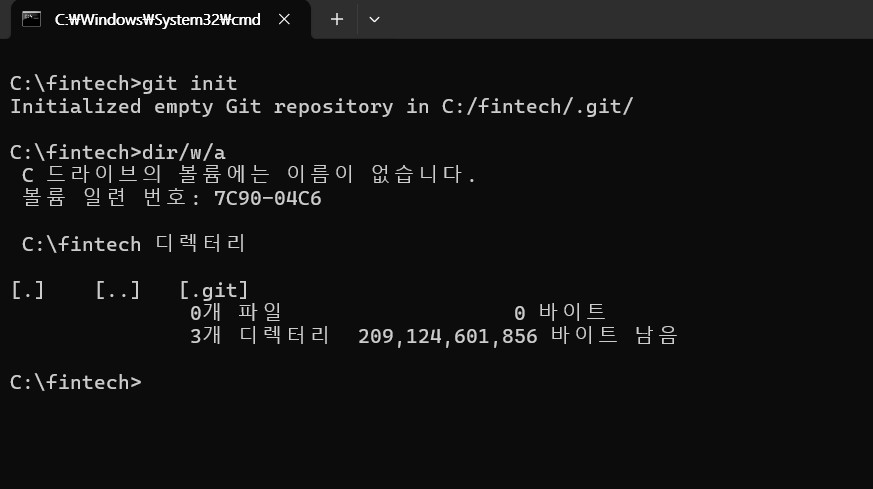 4) dir/w/a 명령을 이용해 .git 디렉토리가 생성되었는지 확인한다.