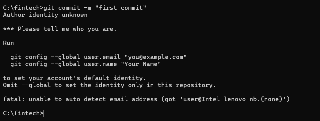 그러면 커밋이 되지 않고 Author identity unknown 이라는 메세지가 나오면서 email과 name을 등록하라고 나온다.