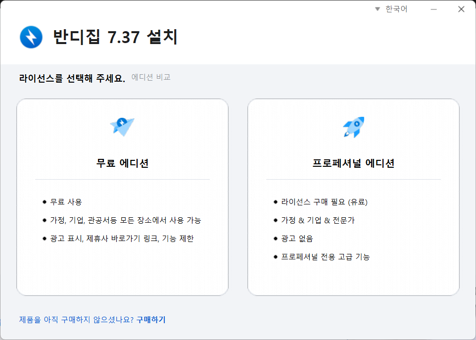 라이선스는 왼쪽의 무료 에디션 선택