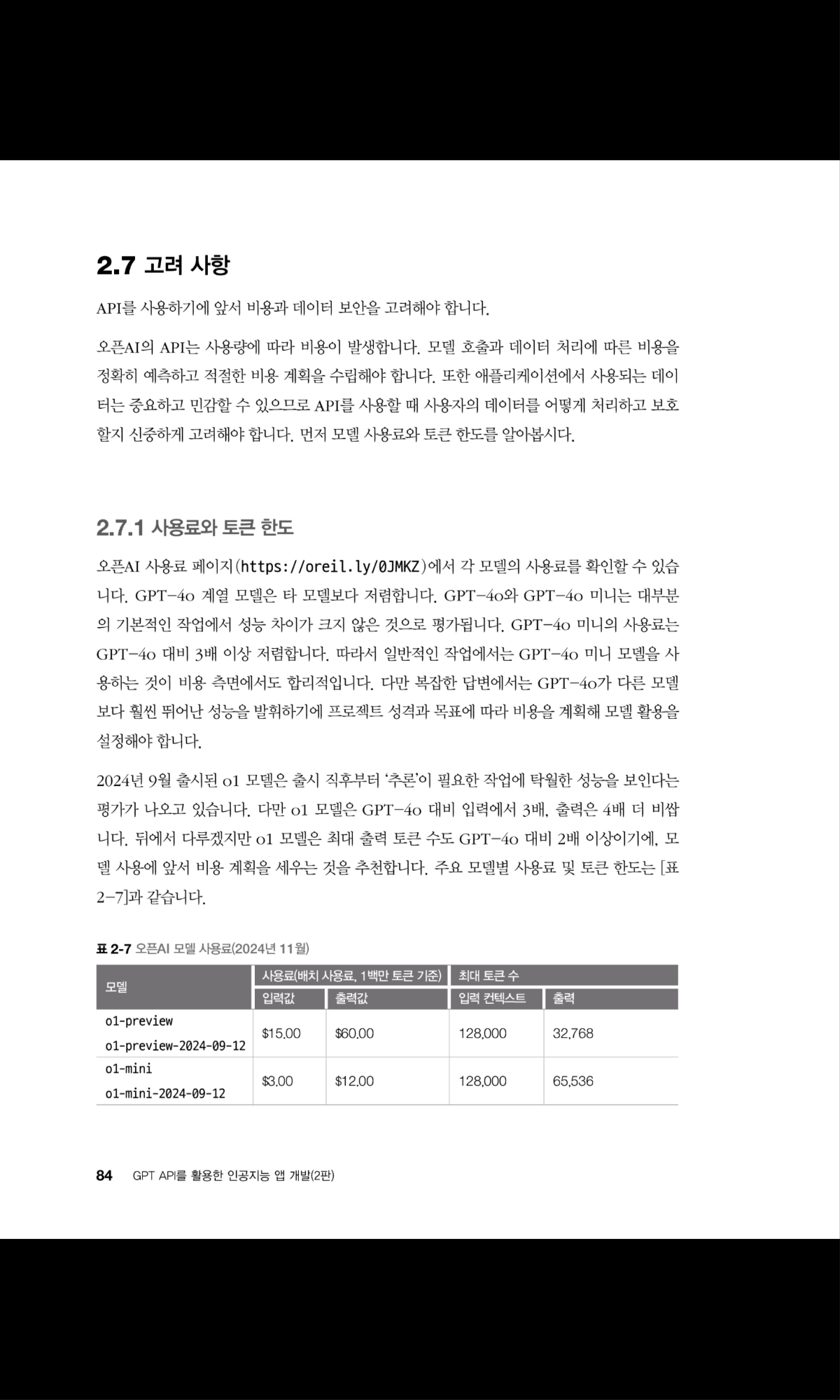 이 책의 가장 큰 장점은 OpenAI API의 인터페이스를 하나하나 자세히 설명해 주고 있고, 실재 앱이나 웹 서비스를 개발 후 운영하는데 있어서 어떤 모델을 사용하는 것이 비용대비 효용성이 높은지까지 잘 설명해주고 있다는 점입니다. OpenAI API에는 다양한 모델이 있고 4o 같은 모델의 성능이 좋긴하지만 마구 사용하다가 보면 비용이 상당히 많이 발생합니다. 그래서 가격과 성능을 놓고 고민을 해야 하는데 이 책에서 잘 설명하고 있어서 상당히 도움이 많이 되었습니다.