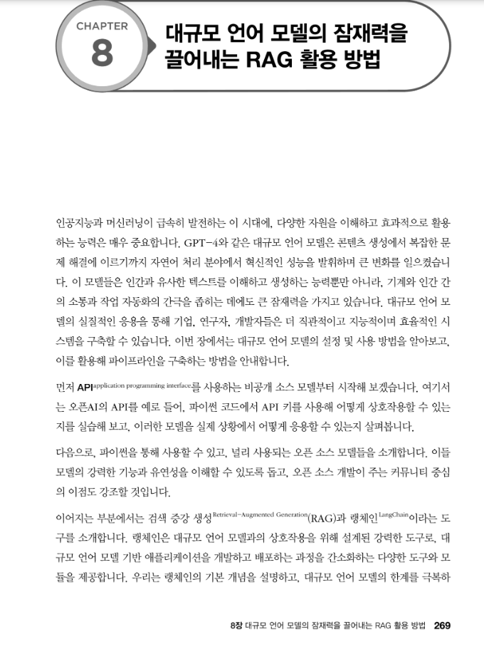 세 번째 장점은 최근 LLM의 문제를 해결하는 방안으로 최근 각광받고 있는 RAG와 인공지능 서비스를 개발하는데 있어서 최근 사용되고 있는 Langchain에 대해서도 자세히 설명하고 있다는 점입니다.
