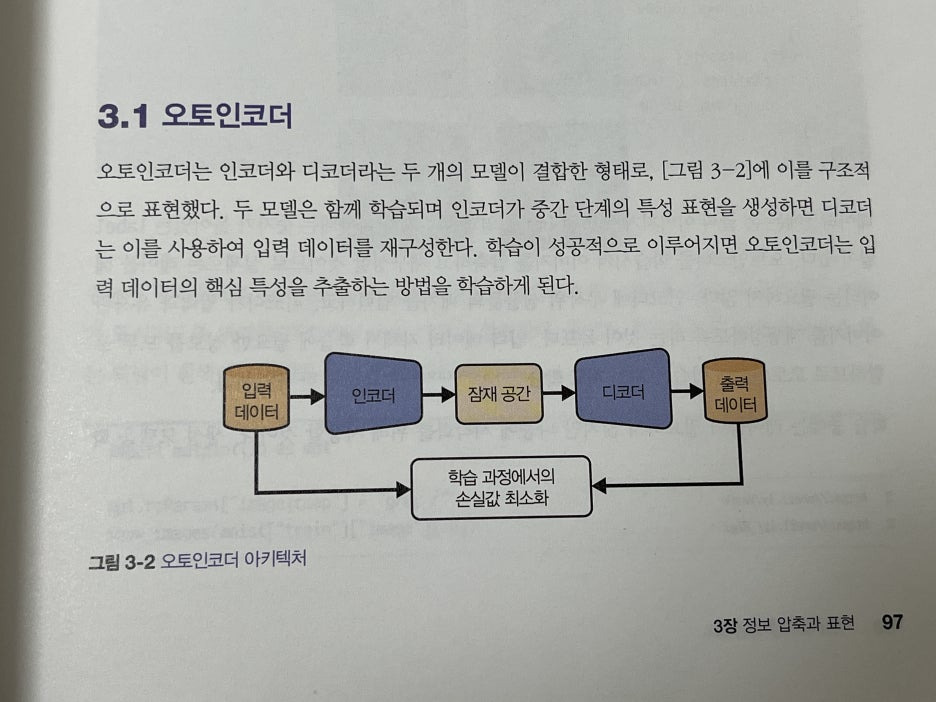 3장 정보 압축과 표현에서는 생성형 이미지 모델의 근간이 되는 오토인코더부터 나옵니다.