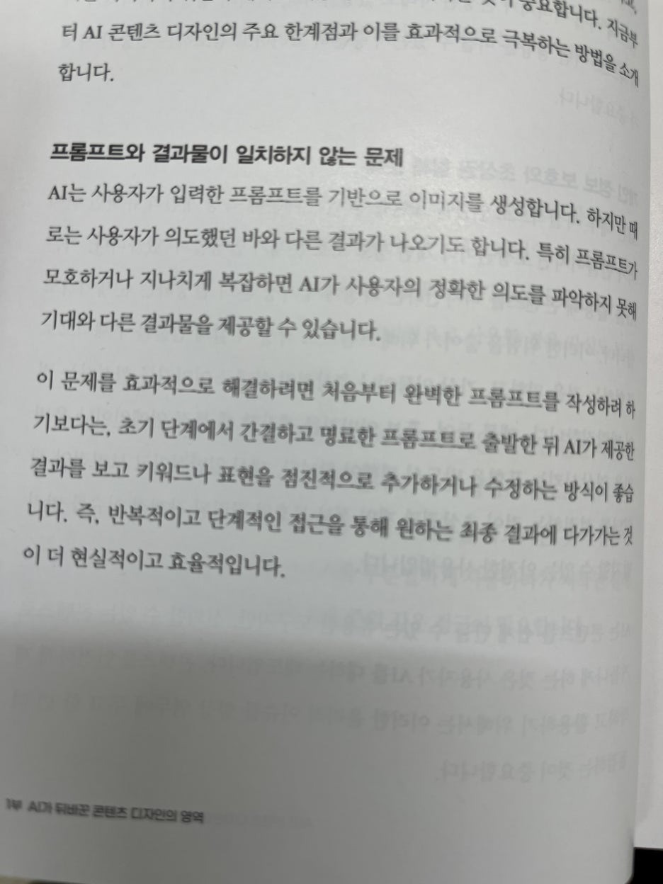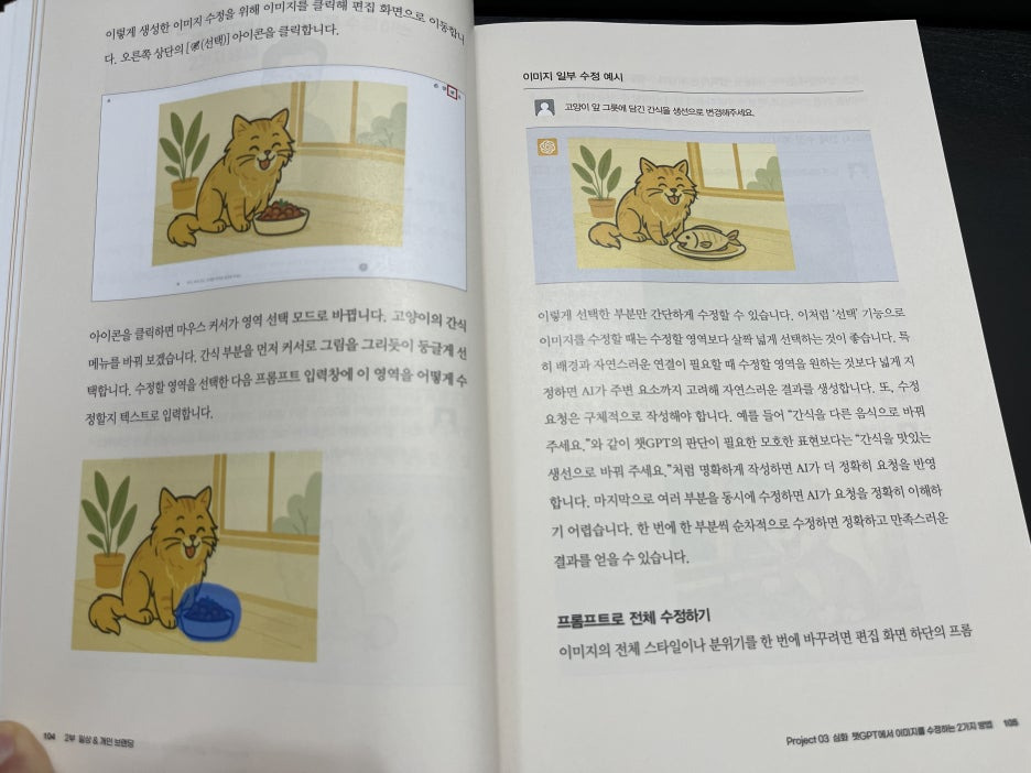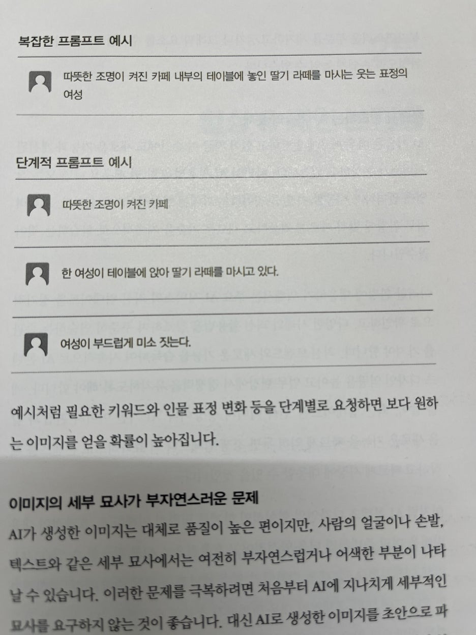 먼저 결론부터 말씀드리면 이 책을 통해서 이미지작업을 아주 쉽게 할 수 있고, 실제로 아주 유용하게 활용할 수 있게 됩니다. 특히 프롬프팅하는 방법이 아주 자세하게 나와있고 부분 수정은 어떻게 하는지, 완성된 이미지에 대한 수정과 개선은 어떻게 해야하는지 잘 나와있어 매우 유용했습니다.