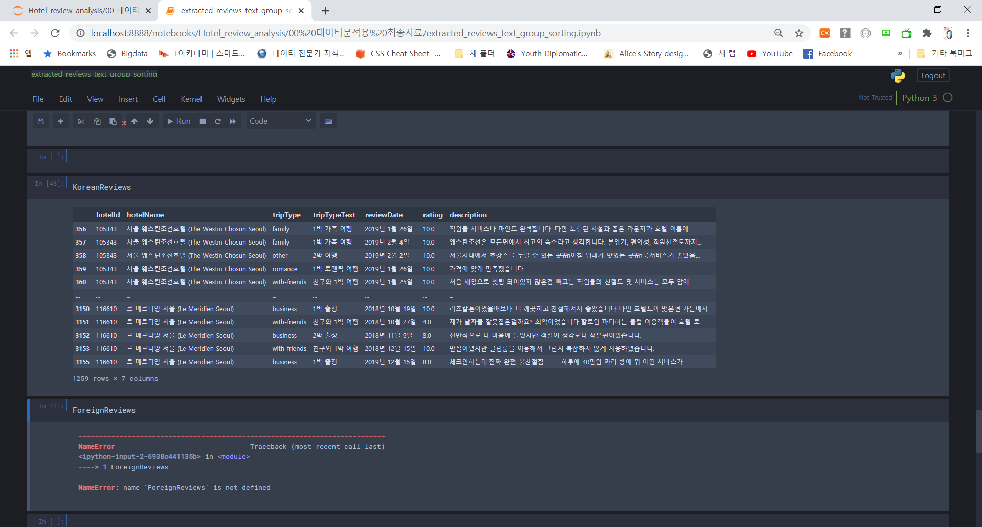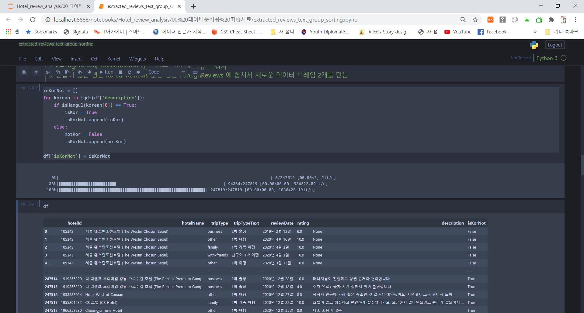 컬럼에서 자료를 읽어와서 한글인지 확인하는 함수로 체크한 후 한글이면 KoreanReviews 아니면 ForeignReviews 라는 이름의 데이터 프레임에 자료를 아래로 추가하는 형식으로 코드를 만들었다.
