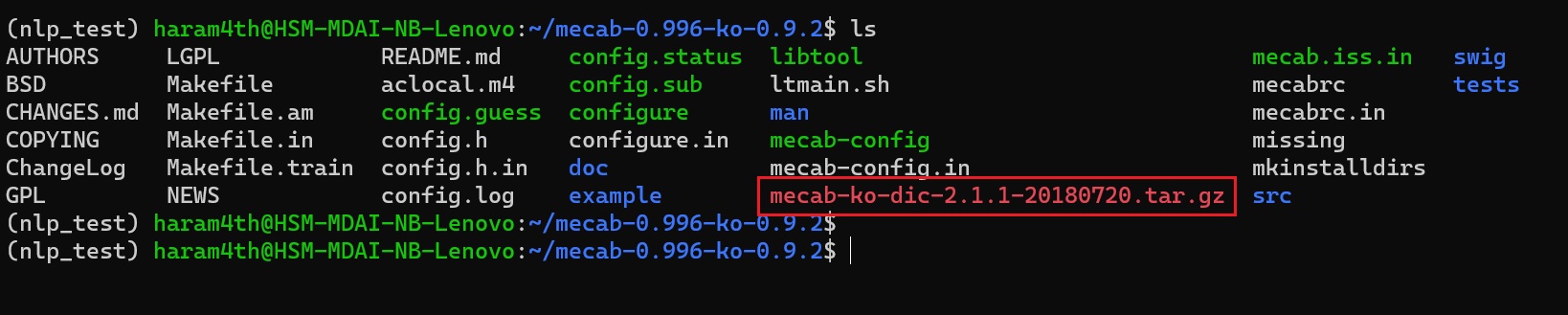 (1) tar xvfz mecab-ko-dic-2.1.1-20180720.tar.gz : 압축해제