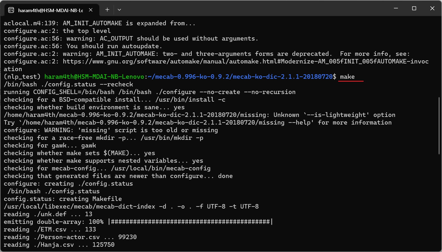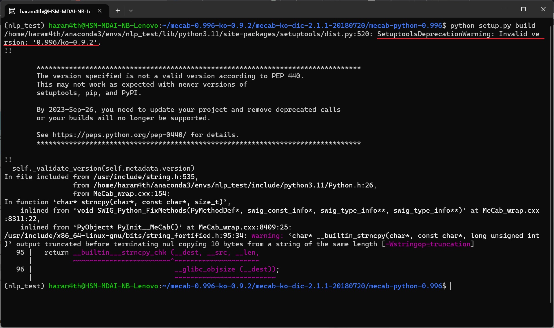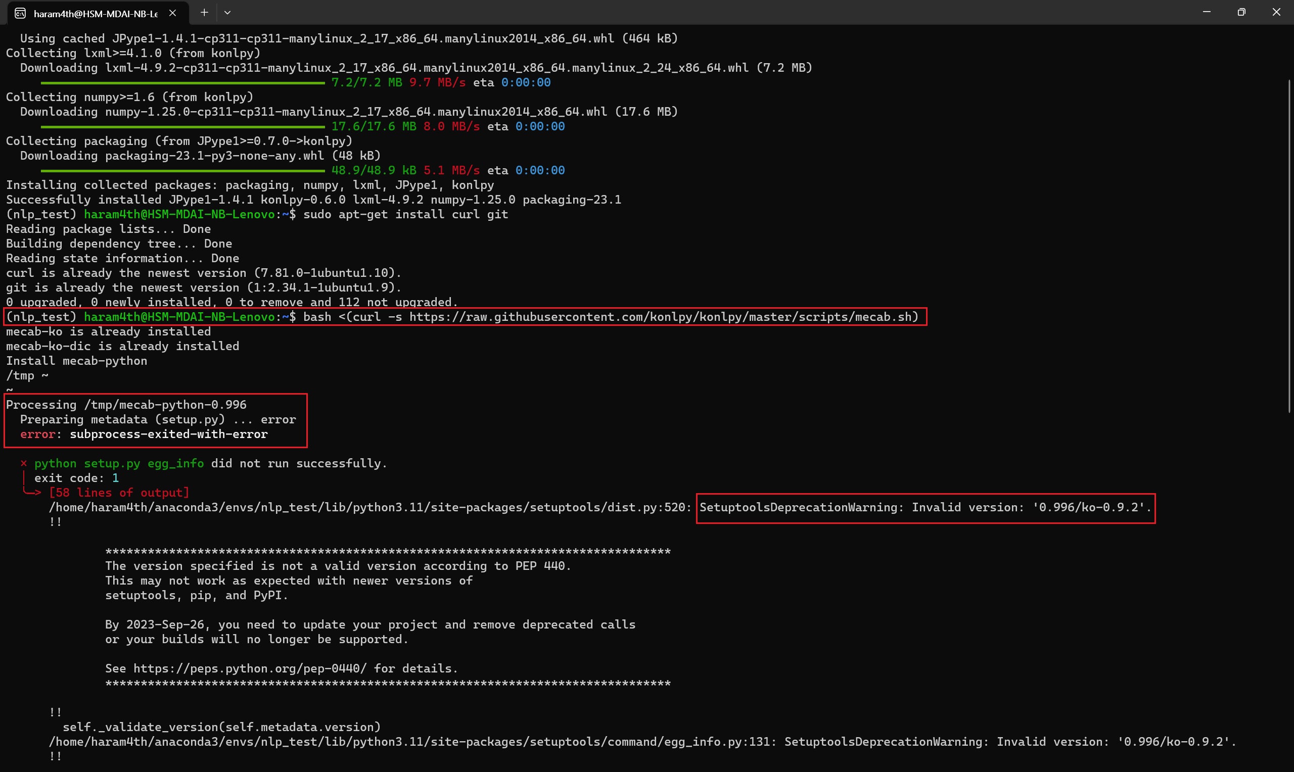 Ubuntu에서 Mecab 설치시 SetuptoolsDepreciationWarning: Invalid version: '0.996/ko-0.9.2' 에러 발생