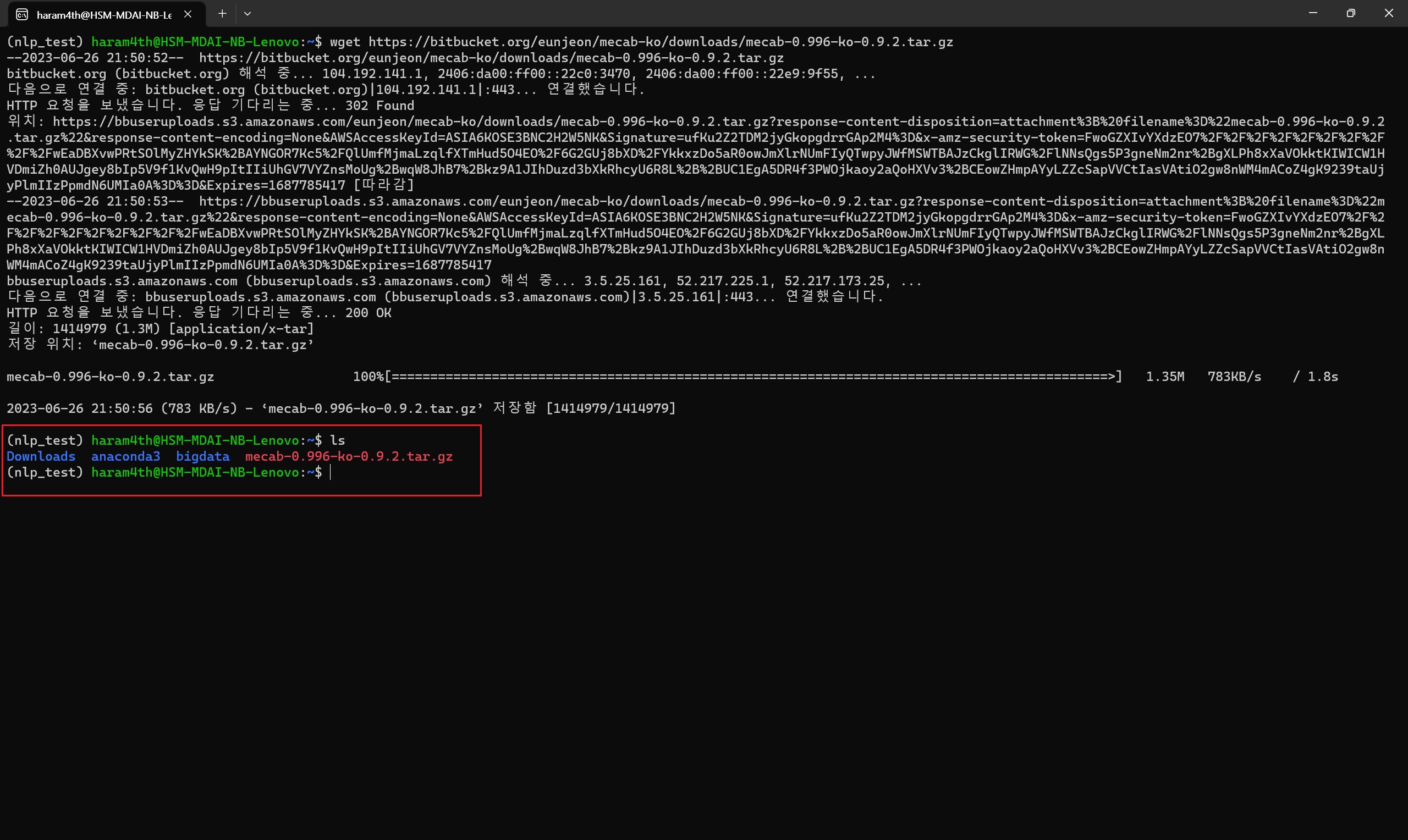 1) wget을 이용해 Mecab 0.996/ko-0.9.2 버전 다운로드