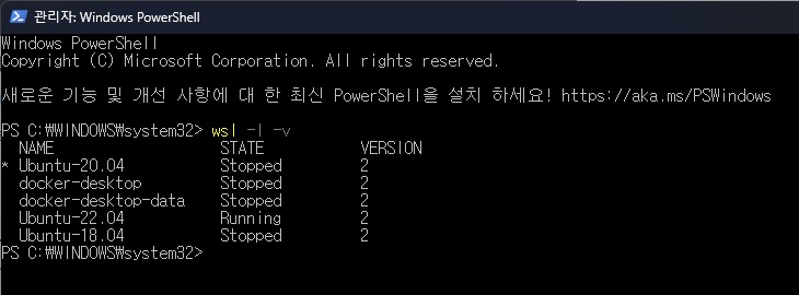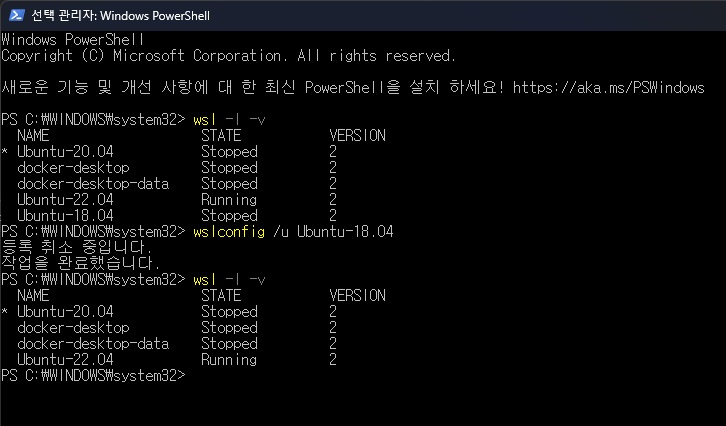 삭제 후 wsl -ㅣ -v 로 다시 확인해 보면 Ubuntu-18.04가 삭제된 것을 확인할 수 있다.