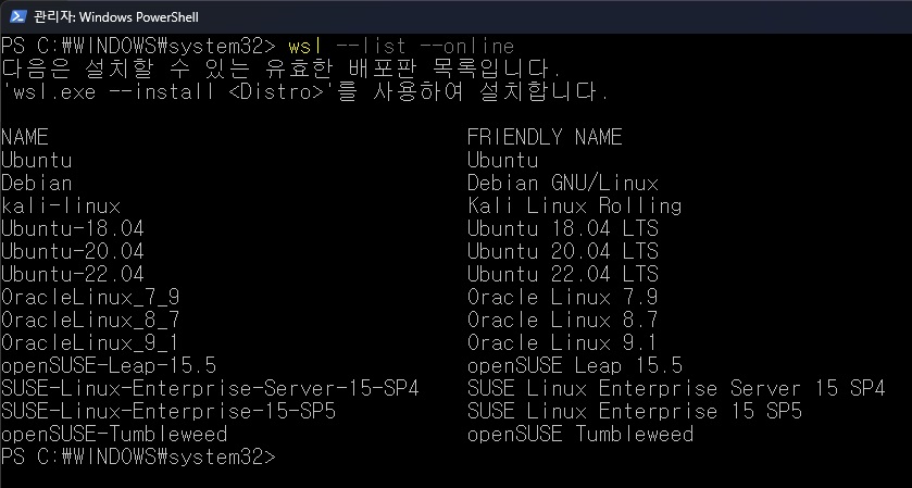 4. wsl에 설치가능한 리눅스 배포판 검색 wsl -l -o