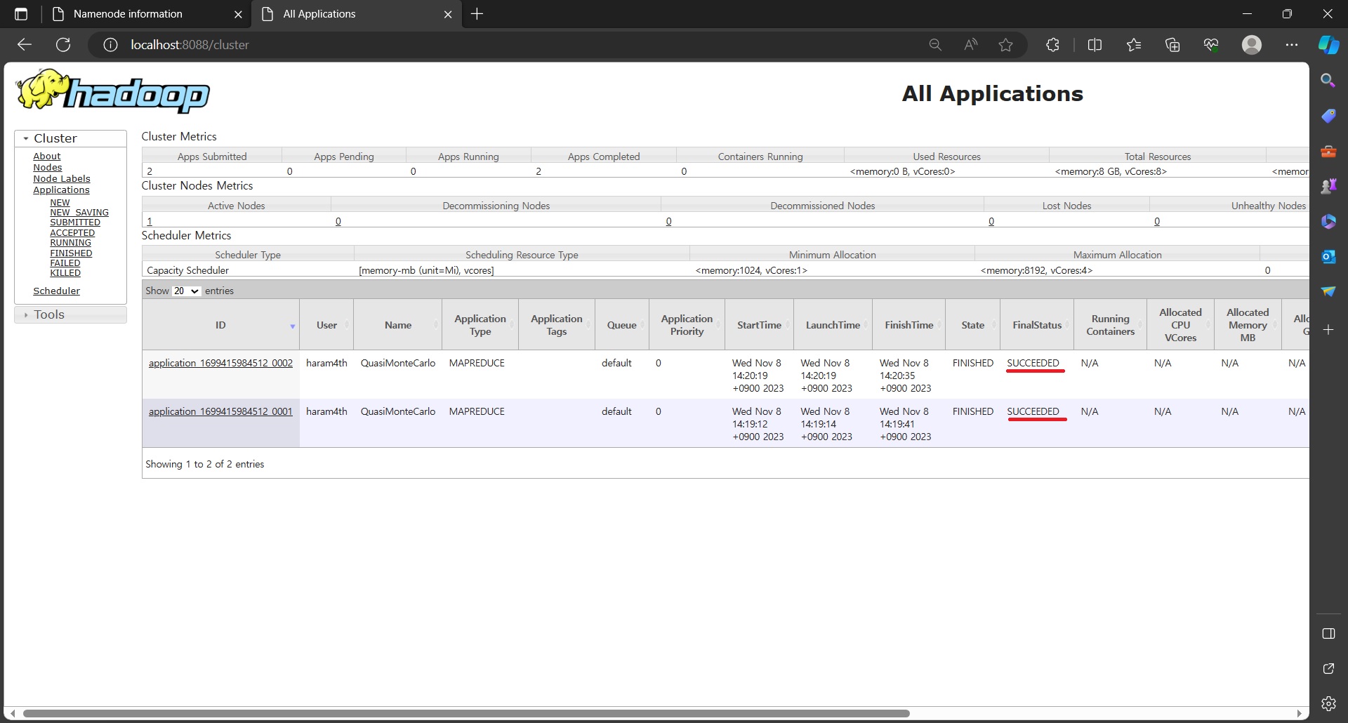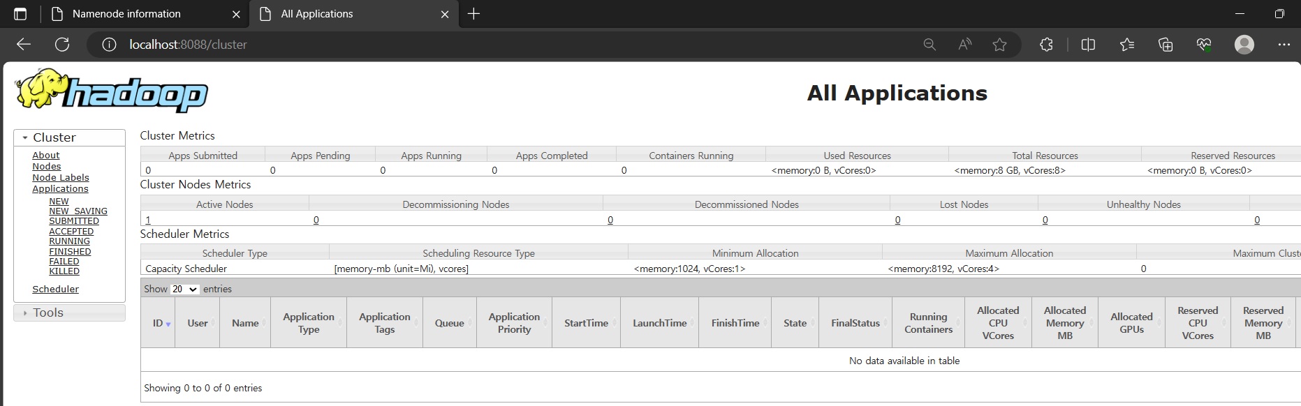 웹브라우저 주소창에 localhost:8088 입력하고 yarn 대시보드 확인