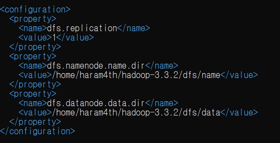 <value>/home/haram4th/hadoop-3.3.2/dfs/data</value> # 본인이 생성한 data 디렉토리 경로로 입력