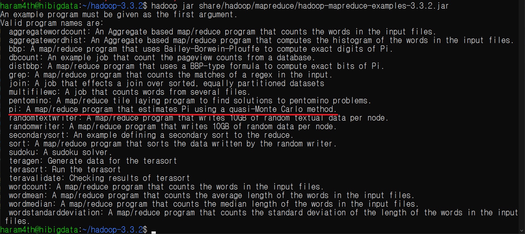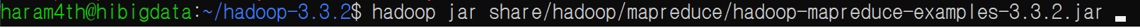 hadoop jar share/hadoop/mapreduce/hadoop-mapreduce-examples-3.3.2.jar