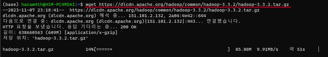 5) wsl ubuntu 터미널에서 wget으로 hadoop 다운로드