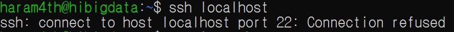 혹시 위의 명령어를 입력했는데 아래와 같이 Connection refused가 나오면 ssh 서버가 동작하지 않는 경우이다.