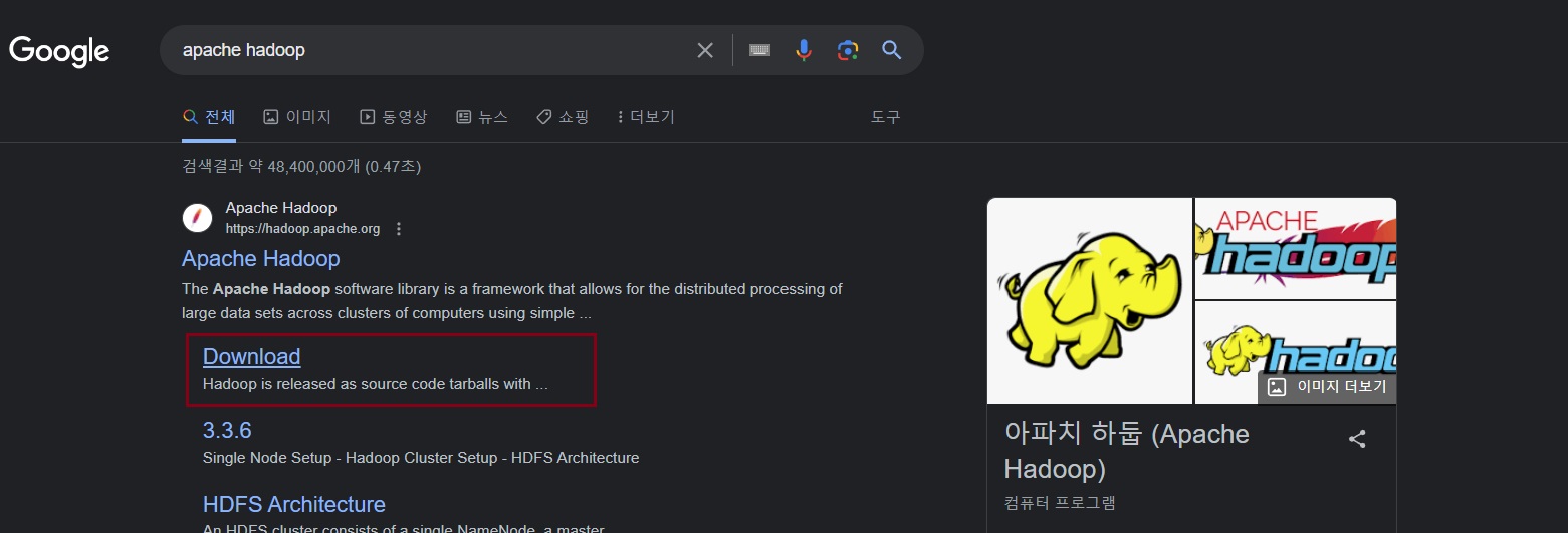 1) google에서 apache hadoop 검색 후 다운로드로 이동