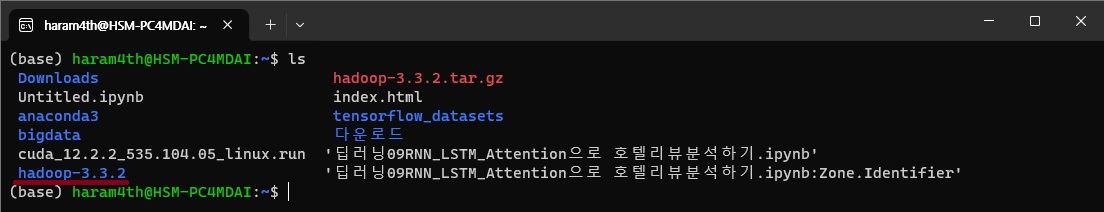 정상적으로 작동하는 것을 확인하고 cd ~/hadoop-3.3.2 폴더로 이동한다.
