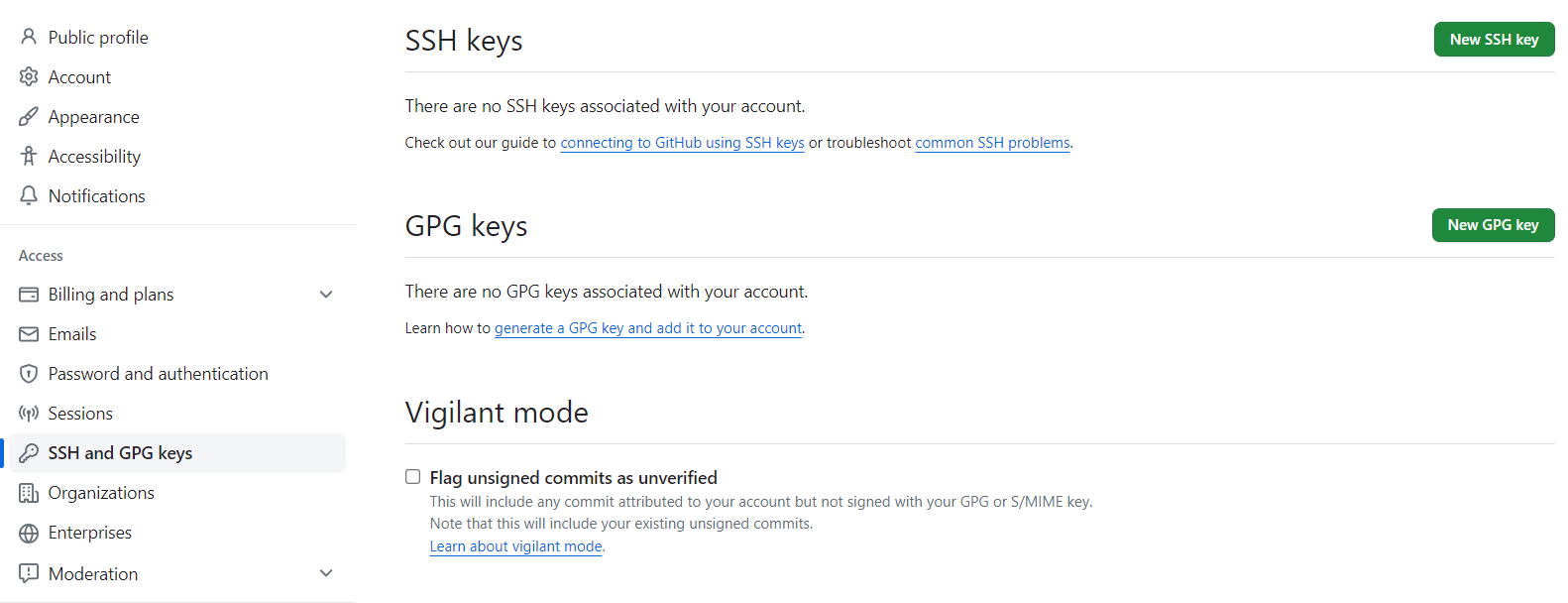 7. GitHub에 로그인한 후, 설정(Settings) => SSH and GPG keys => New SSH key