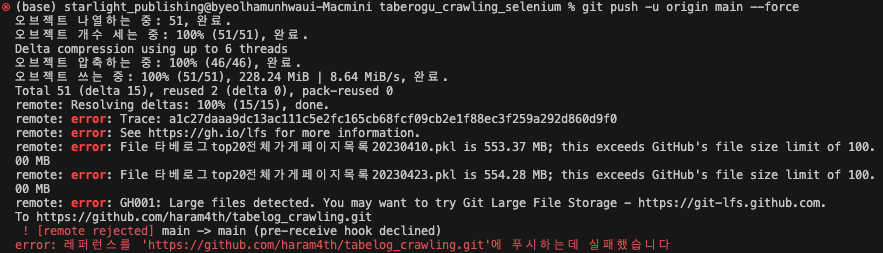 github에 강제로 push해보지만 용량 초과로 push 실패