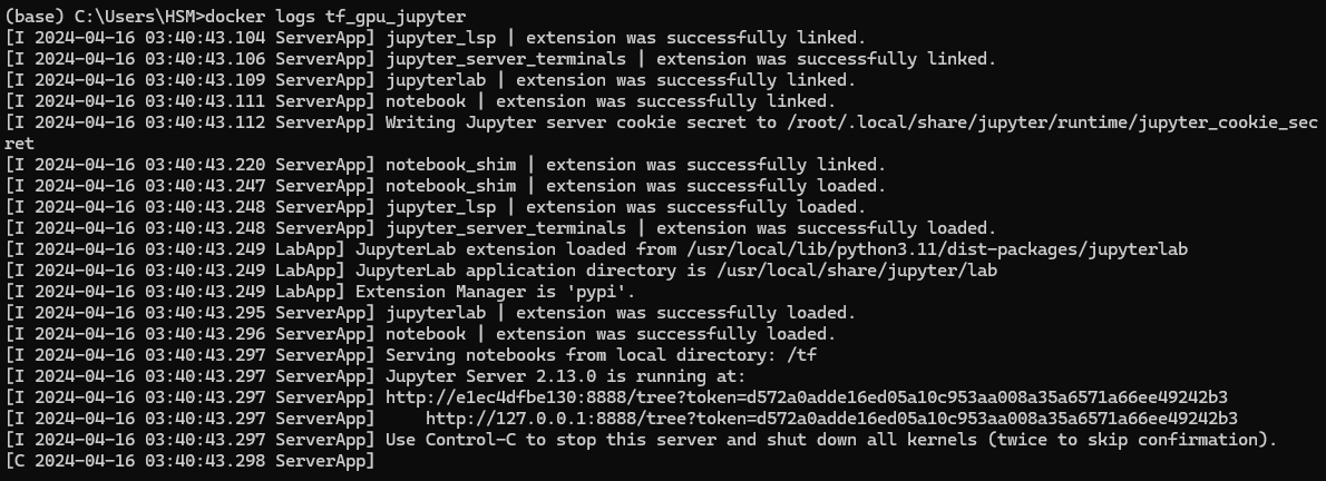 container를 백그라운드로 실행시켰기 때문에 jupyter notebook 주소를 알 수 없으니 docker logs 명령어를 이용해 주소를 찾는다.