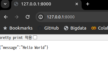 웹 브라우저를 열고 localhost:8000으로 접속 후 결과 확인