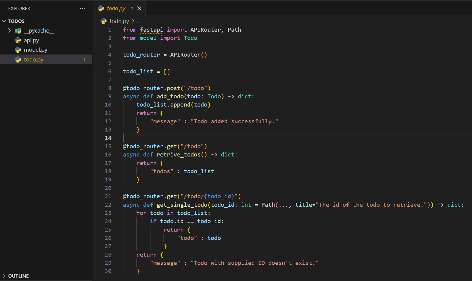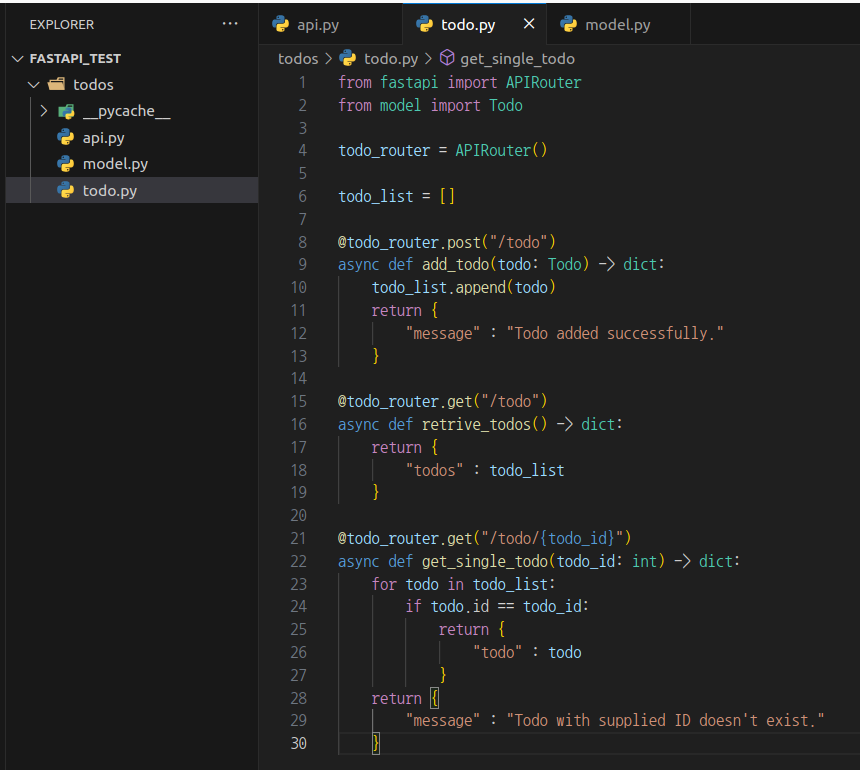 1) todo list의 id로 내용을 조회하게 하기 위해 todo.py에 get_single_todo함수를 정의하고 라우터에 경로 매개변수를 추가한다.