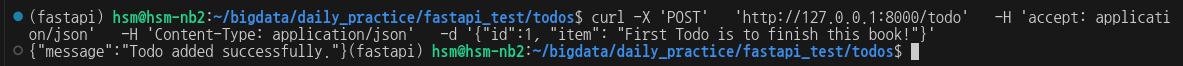 curl -X 'POST' 'http://127.0.0.1:8000/todo' -H 'accept: application/json' -H 'Content-Type: application/json' -d '{"id":1, "item": "First Todo is to finish this book!"}