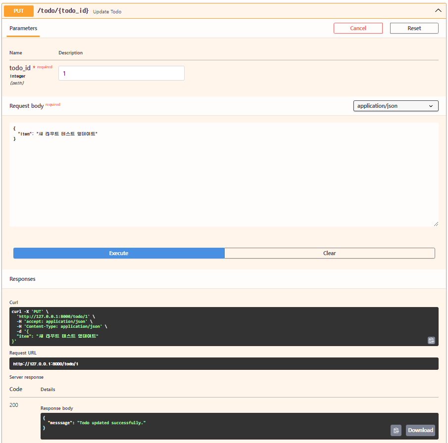localhost:8000/docs의 put /todo/{todo_id} Update Todo의 try it out을 누르고 todo_id에 1, Request body의 "item" : "string"부분의 string에 새로 업데이트할 내용(새 라우트 테스트 업데이트)으로 바꾸고 excute를 누른다.