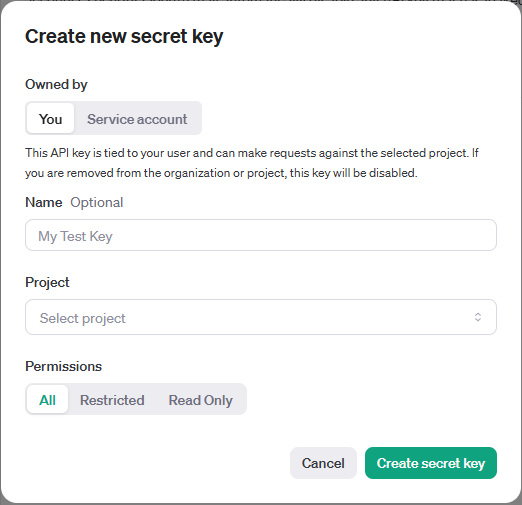 화면에서 + Create new secret key 버튼을 찾아 누르고 api key를 생성한다.