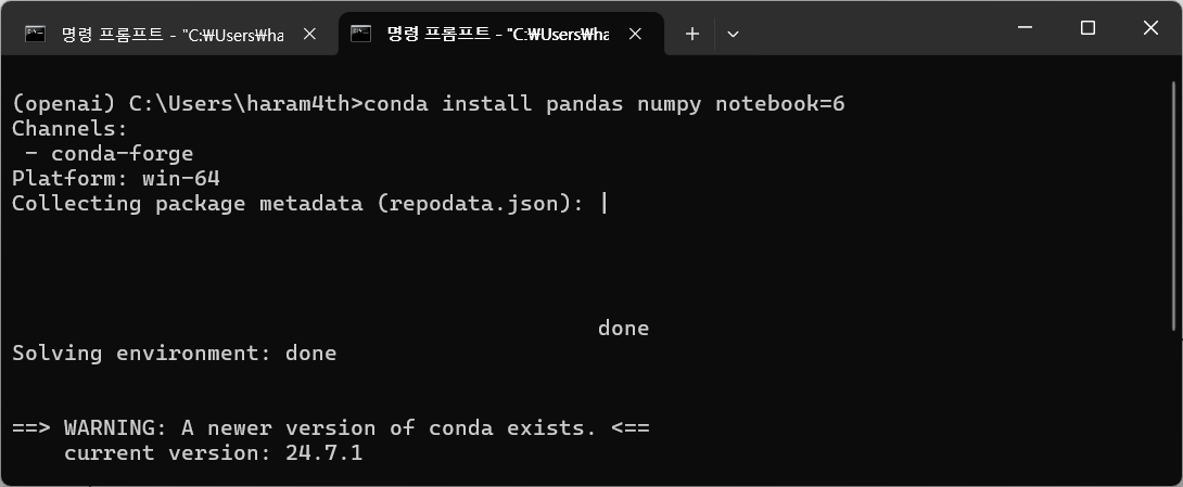 2) 생성한 가상환경으로 들어가서 pandas, numpy, jupyter notebook 6버전 설치