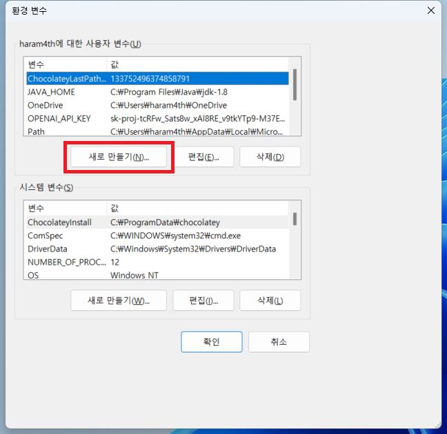 5) 확인을 누르고 사용자 변수 목록에 OPENAI_API_KEY 등록 여부 확인