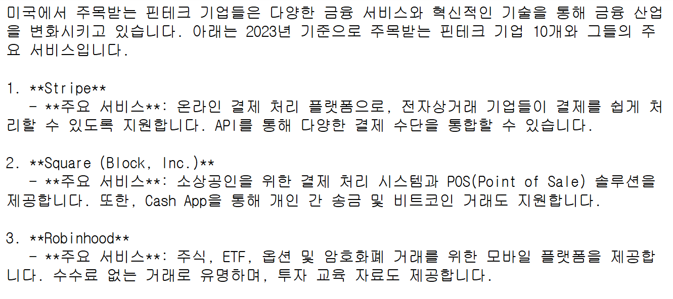 | stop | 응답 생성을 멈출 시점을 정의할 수 있는 문자열 또는 문자열 배열 | stop=["\n"]는 줄바꿈에서 응답 생성 중단 | |