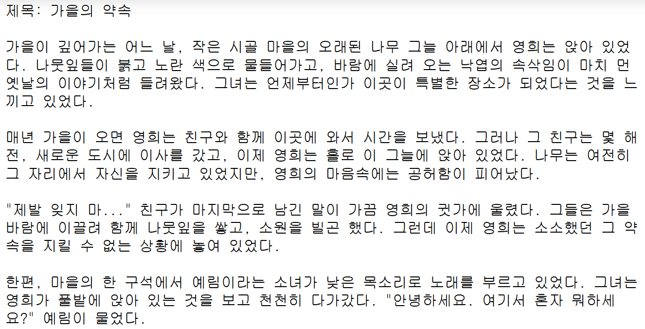 "role": "user", "content": "가을에 관련된 단편 소설 써줘"