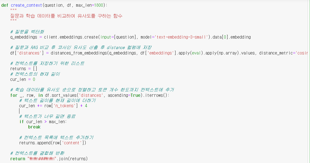 (3) 질문과 csv 자료를 합쳐서 만든 context를 gpt에서 퓨샷으로 학습시킨 후 질문에 답하도록 하는 함수 작성